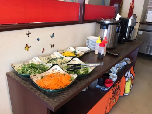 サラダバーは、野菜5種にドレッシングも3種用意されており、普段、なかなか野菜がとれない人にも嬉しいサービスです。