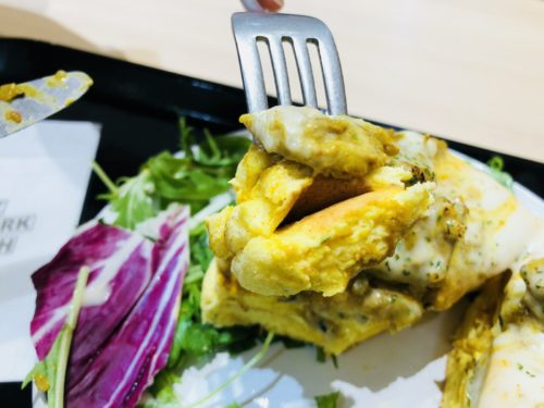 パンケーキにスパイシーカレーがかかっているなんてっ!!食べたことのない未知のパンケーキにドキドキしました。