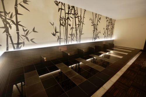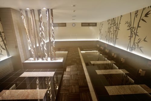 人気の岩盤浴は、落ち着いた竹灯りの中でゆったりと。
