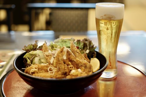 お店オススメのメニューをいただきましょう。早速、【手羽先唐揚げ中華風】と【ビール】を注文しました。