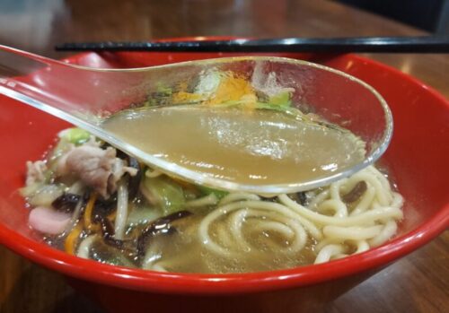 スープはレンゲに負けないくらいの透明度。鶏ガラスープを使用されています。