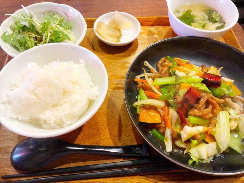 今回は「牛肉の甘酢唐辛子炒め」を注文!メインの他にごはん、漬け物、スープ、サラダがついています。