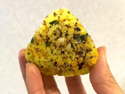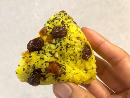 ターメリックで色づけされたご飯に、甘いレーズンと、カリカリ香ばしいアーモンドの食感が楽しめて、これは子どもでも食べられるおにぎりです。