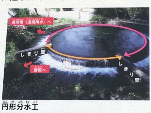 昭和31年に作られた円形分水の構造はこのようになっています。円筒の中心からわき出す水を、2枚のしきり壁で仕切ってあり、通潤橋に行く水と、野尻地区に行く水を、7:3の比率で分けているそうです。