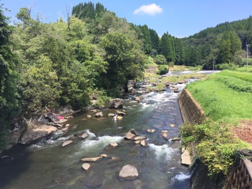 橋から見る景色は、なんとまあ美しい景色!日本の原風景といった感じで、川底の石まで透けて見えます。川で泳ぐ子供たちもいました。