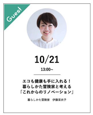 翌日のセミナーは「エコも健康も手に入れる!暮らしかた冒険家と考える『これからのリノベーション』」というテーマで13時から開催!「暮らしかた冒険家」という独特の肩書きをもつ伊藤菜衣子さん。
