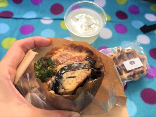 私は、ケークサレやワッフルを買って、レジャーシートを敷いて、友人とゆったり。