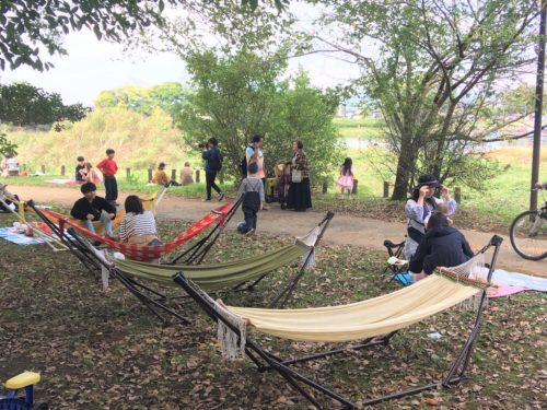ハンモックやテント、さらにソファーも置いてあったり、みんながのんびりくつろげる空間作りが素敵です。