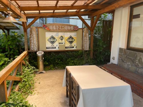 入口横のテラススペースには、キジ馬や「だんだんなあ」といった球磨弁ミニ博物館の掲示も…