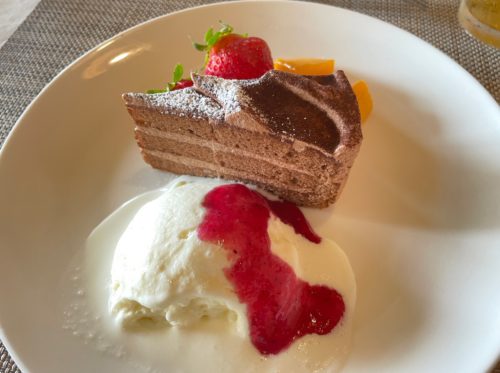 チョコレートケーキにバニラアイス、マンゴーといちごが添えられていました。
