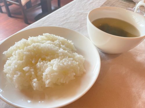 メインには、ライスとスープがついていて、スープはわかめスープ。
