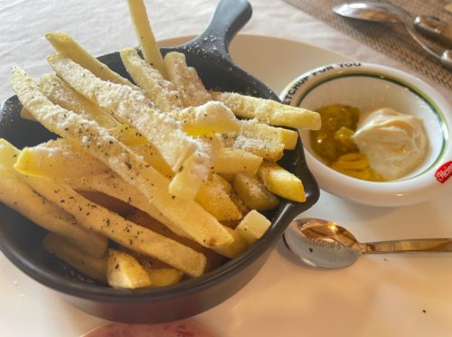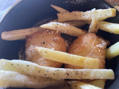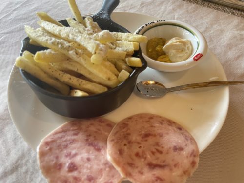 そして次は、トリュフパウダーのかかったフライドポテト。ボロニアソーセージのサービスもついてきました。