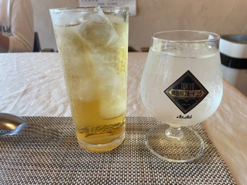 水素水と、ドリンクメニューからチョイスしたポンジュース・アップル100%。