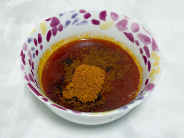 そこに、一味唐辛子とかつお粉がブレンドされた特徴的な粉がたっぷりと掛けていただきます。