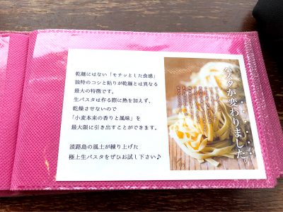 パスタ麺も極上生パスタが使用されています。生パスタはモチモチとした食感だそうで、やみつきになりそう…