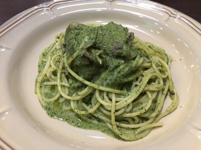 続いてメインのパスタ。濃厚な大葉のソースが絡んだパスタに、薄切りの牛肉がたっぷり。大葉のさわやかさと牛肉のうまみが調和して、これまた絶品!