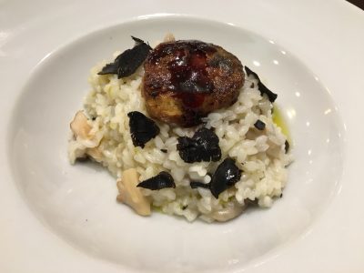 リゾットの上には、大きなフォアグラと黒トリュフ。食べてみると、フォアグラは柔らかく、リゾットはお米のしっかりした食感が残されていて、期待以上のおいしさでした!