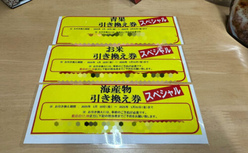 それぞれの「スペシャル引換券」。1月10日から引き換えなので内容は不明ですが、恐らくこの3枚で1万円相当はあると思います。
