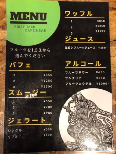 メニューは、新鮮なフルーツを使ったパフェやスムージーに、ジェラートやお酒などが展開されています。