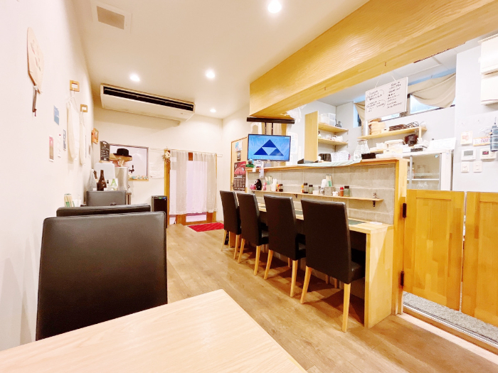 カウンターの席数も多いので、おひとりさまでも入りやすい。テレビを見ながらほっと一息ついてお食事を楽しめます。なんだか実家みたいにリラックスできるお店です。