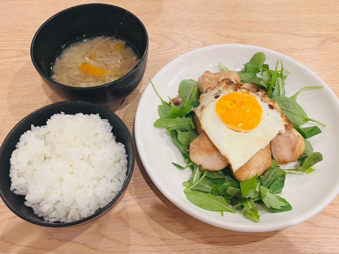 私は照り玉ちきんをお願いしました。メイン料理にお味噌汁、ごはんがセットになっています。