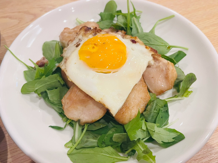 メインは、たっぷりの野菜に甘めのタレで焼かれたチキン、そして目玉焼き。シンプルだけど間違いないですよね。