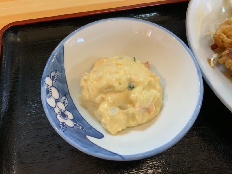 小鉢のポテトサラダ。最初、こっちがタルタルソースだと勘違いしたのは内緒。具沢山でゴロゴロしています。