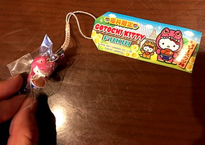 「ソースカツ丼」は福井県でも有名なB級グルメだそうで、県内で多くの特徴あるお店が存在します。また福井には「恐竜博物館」もあるので、恐竜の着ぐるみを着てソースカツ丼を持つキティちゃんという謎のスタイルに!