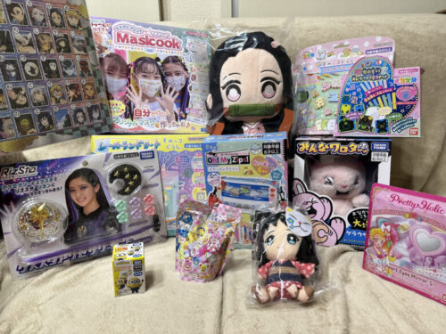 女の子用は、鬼滅の刃ひらがなパズル、マスクにプリントマスクック、リズスタアクセサリーセット、すみっこぐらしのシールランドリーナ、すみっこぐらしのオーマイジップス、みんなワロタww、ハートアイズミラー、プリキュアのバスボム、ミニオンのキャラぴコロン、鬼滅の刃竈門禰豆子(かまどねずこ)45cmぬいぐるみ、鬼滅の刃真菰(まこも)ミニぬいぐるみ、すみっこぐらしのオリケシ、オリケシ専用光るキラキラ蓄光セットの13点、そしてお年玉のシルバニアファミリーのお家で合計14点も入っていました!