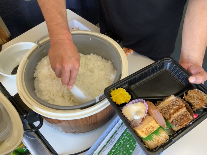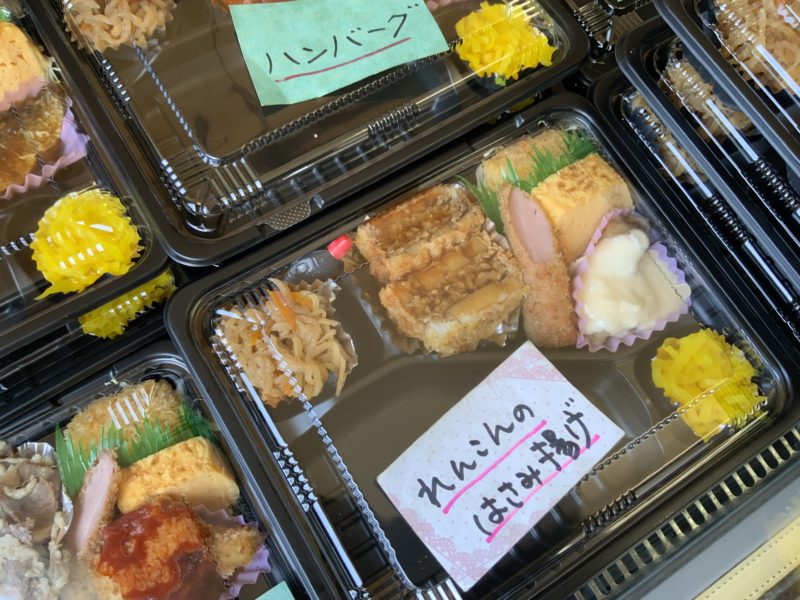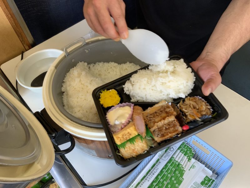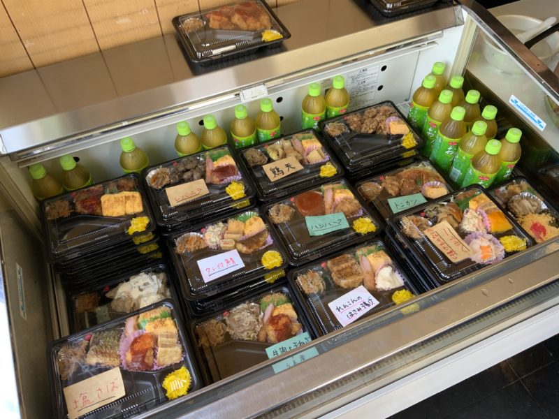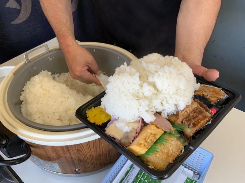 こんな感じで、種類豊富なお弁当が並んでいます。お弁当を選ぶとあつあつのご飯をついでくれるシステムです。