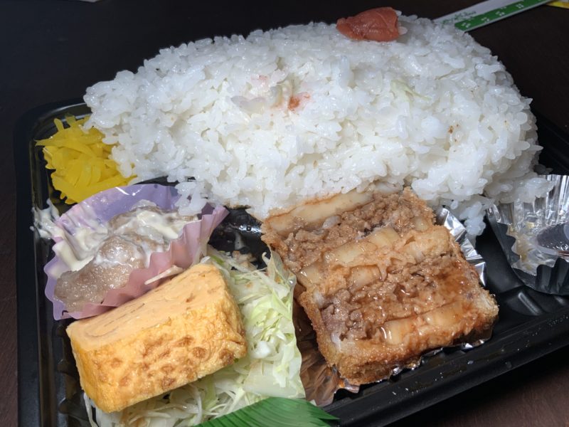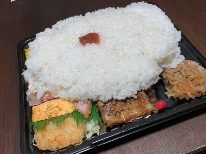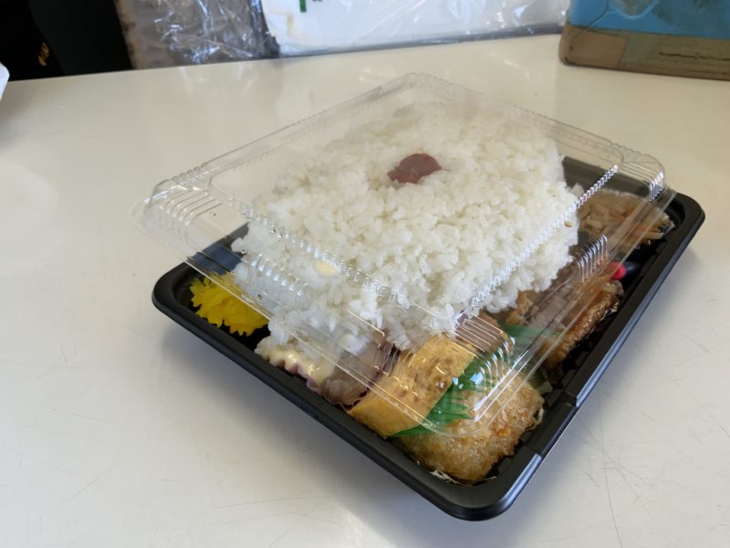 ということで、益城町にある「ふくちゃん弁当」で、どえらい量のご飯をよそってくれるお弁当をいただきました!