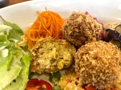 中央のコロッケのようなものがファラフェルなのですが、ころころしていて、かわいいフォルム…!