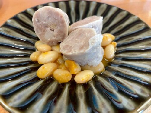 そして、お肉とお豆の一皿は、白いんげん豆の煮込みと、無薬飼料と美味しい天然水で育てられた、こだわりの香心ポーク。