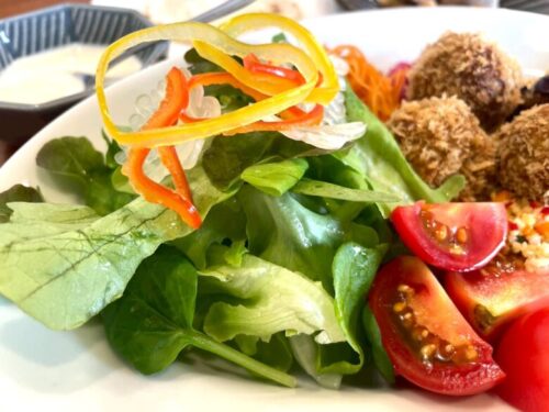 フレッシュな葉物野菜やパプリカ、ゴーヤ、トマトなど、サラダもたっぷり盛られていて、ヨーグルトと自家製マヨネーズのさわやかなソースもついてくるので、野菜やファラフェルにかけて楽しめます。