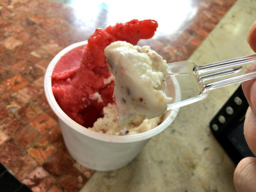 店内イートインスペースにて早速ジェラートをいただきました。今回はバナナ&ストロベリーのダブル。