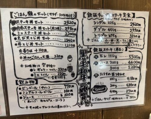 お肉のメニュー。お目当てはステーキ丼セット(2,420円)で贅沢なランチです。