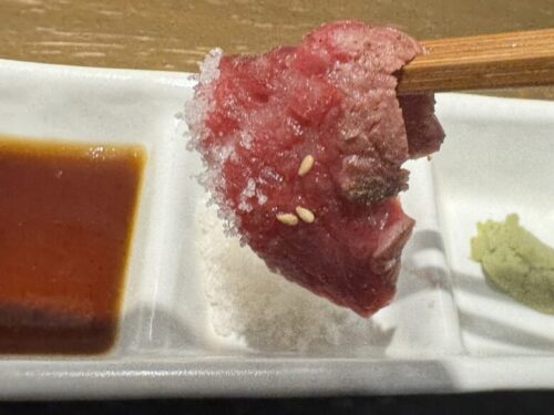 こちら臥璽廊では提携の牧場「高手牧場」から黒毛和牛一頭飼いだそうで、熊本で有名な赤牛とは違いますよ、との事。