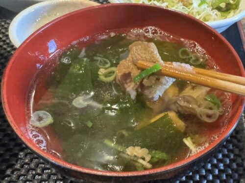 ほっと落ち着くお吸い物のお味は、これ肉うどんの味だぁ!+220円でミニうどんに出来るので、そうすればよかったなと思いました。絶対にうどんも美味しいに決まってる、と確信するお出汁。