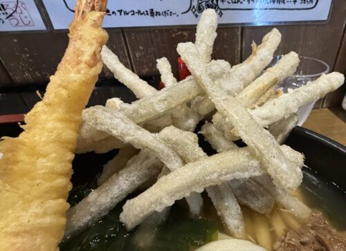 えび天、ごぼ天、肉、山芋、卵、わかめが乗っています。