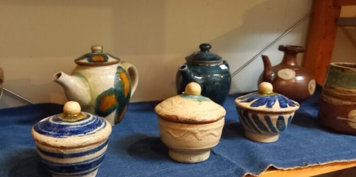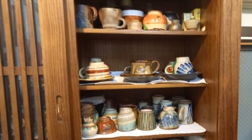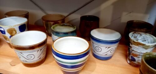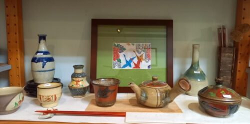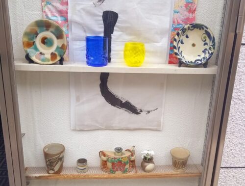 陶器の店、とあるし、ディスプレイには陶器とガラスが。