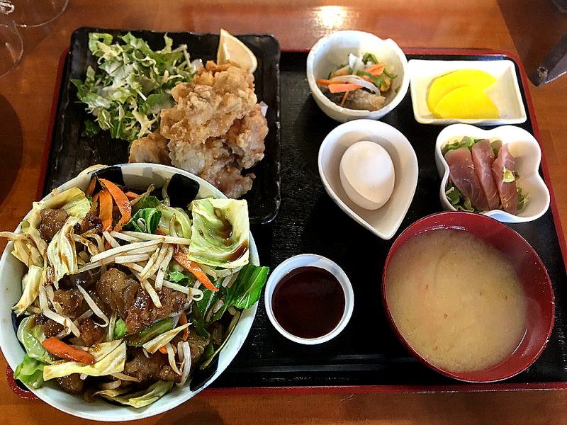 ガナール丼、唐揚げ、味噌汁の他に、2種類の小鉢にはお刺身と南蛮漬け、さらにたくあんに生卵まで添えられた圧倒的ボリューム!