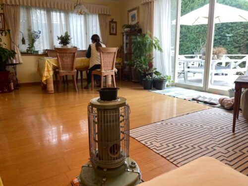 お庭が見える大きな窓があり、室内はテーブル席やソファー席。そしてストーブがあり、なんともあたたかい雰囲気。