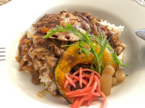 かぼちゃやれんこん、らっきょうなどもついていて、辛さもほどよく、満足度の高いカレーでした。