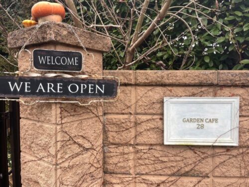住宅街の中の茶色いブロック塀に囲まれた場所で、「GARDEN CAFE 28」の看板が目印です。
