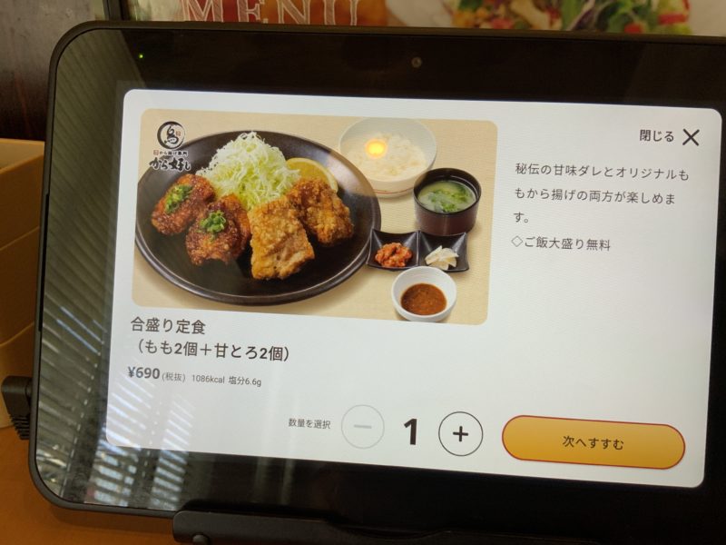 店内で食べる時はタッチパネルでポチポチっと。普通の唐揚げとタレが絡めてある「甘とろ」がどっちも乗った「合盛り定食」をチョイス。