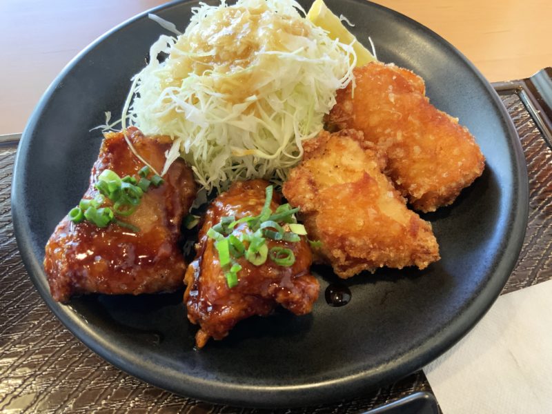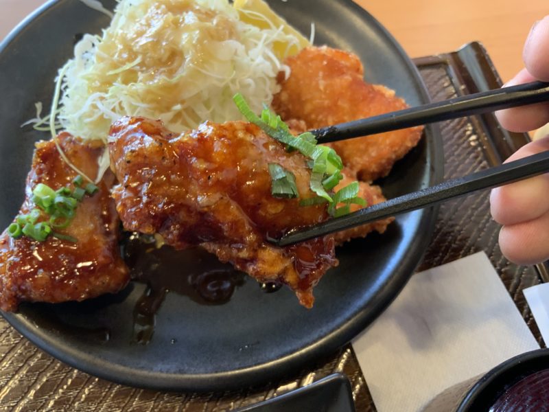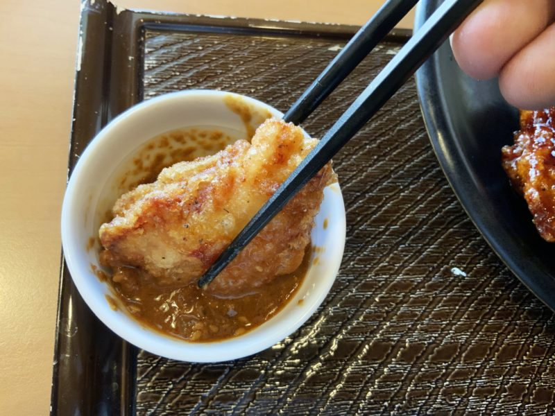 問題はこの唐揚げです。普通の唐揚げ(右)が2個と、タレの絡まった「甘とろ」(左)が2個。