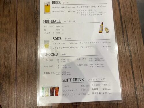 ほかにも、ハイボールやサワー、焼酎にソフトドリンクなど、ドリンク類もいろいろ用意されていますよ。
