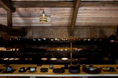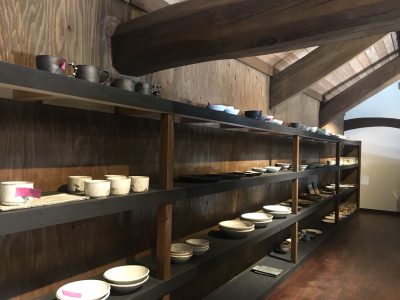 太い梁のある歴史を感じさせる建物に並ぶ陶器の作品たち。見ているだけで飽きません。