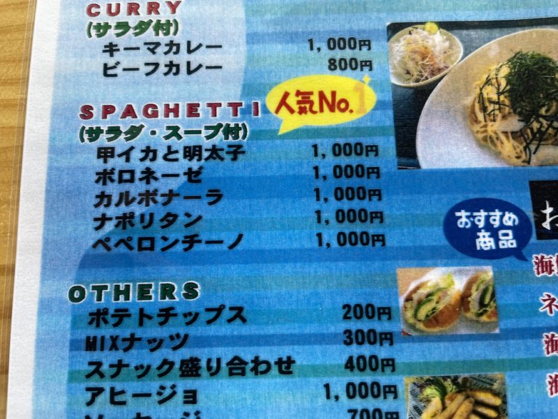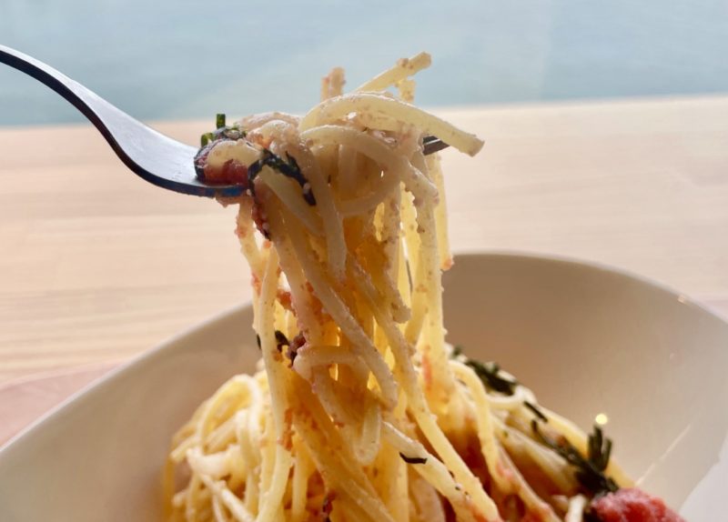 明太子は満遍なくパスタに絡みついてます。海を眺めながらの食事は、おいしさもひと潮。