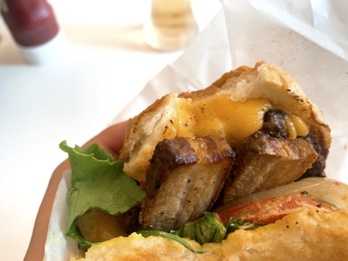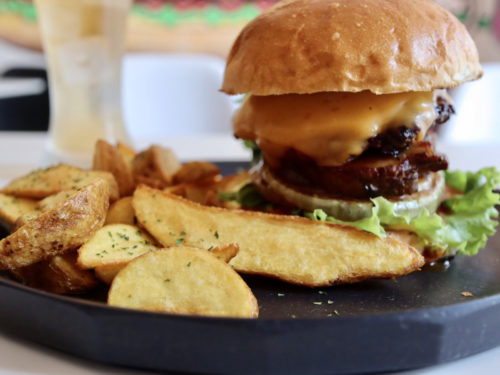 山盛りのポテトが無料でついてきます。パティは表面はカリッとしていて中はふっくら。ボリューミーなチーズによく合います。ひき肉の旨味がしっかり感じられる、肉肉しいおいしさです。